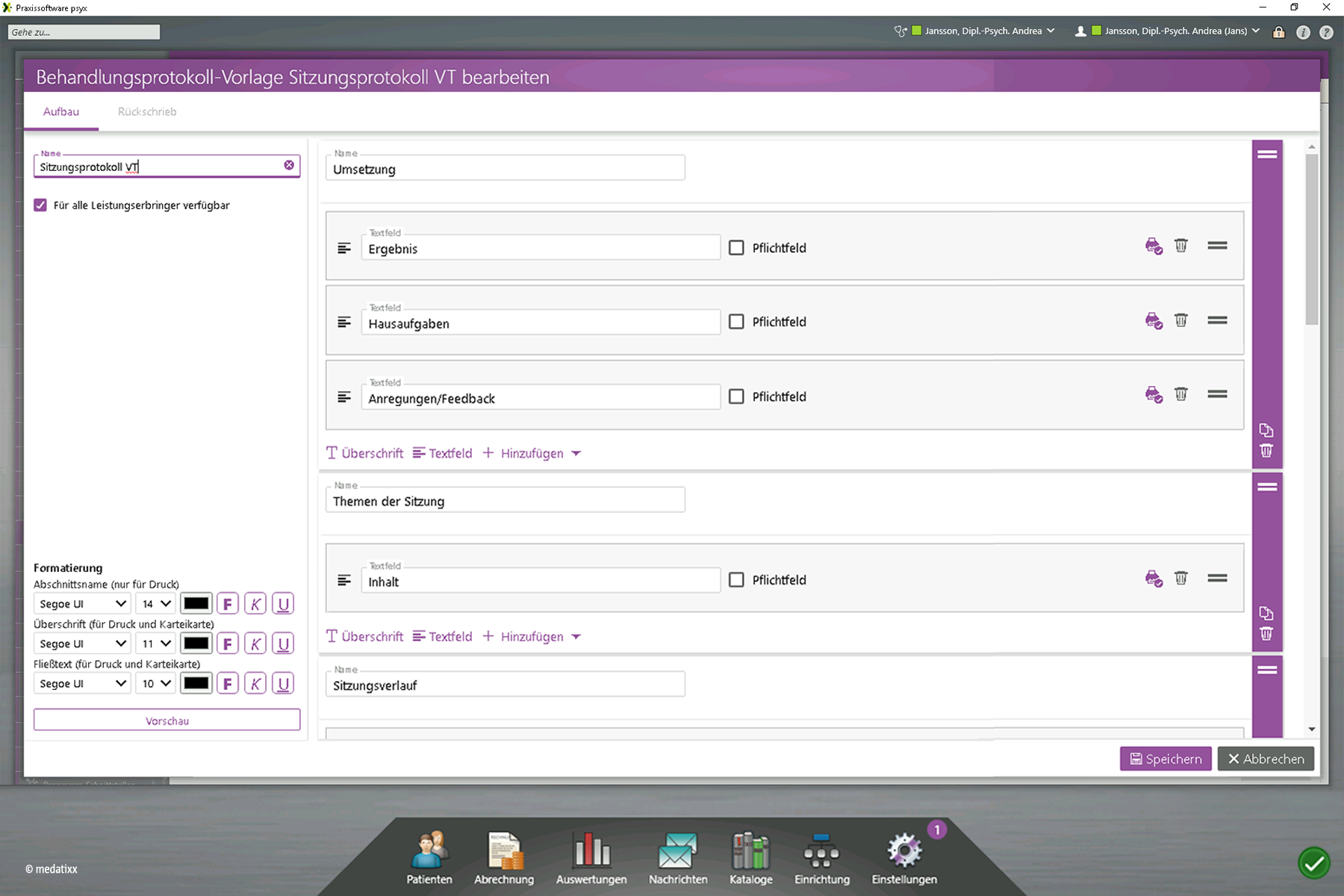 Gestalten Sie Ihre eigene digitale Protokollvorlage: Mit dem Behandlungsprotokoll haben wir in psyx einen Editor integriert, um Protokollvorlagen selbst zu erstellen und für verschiedene Abläufe nutzen zu können. Beispielsweise für Ihr individuelles Sitzungsprotokoll auf Basis der Behandlungsform, des Settings oder des jeweiligen Krankheitsbildes. Zusätzlich haben Sie die Möglichkeit Skalen zu integrieren. Auch handschriftliche Notizen können Sie einfach einscannen oder abfotografieren – und danach im jeweiligen Protokoll ablegen. So finden Sie alle sitzungsbezogenen Inhalte an einer Stelle.